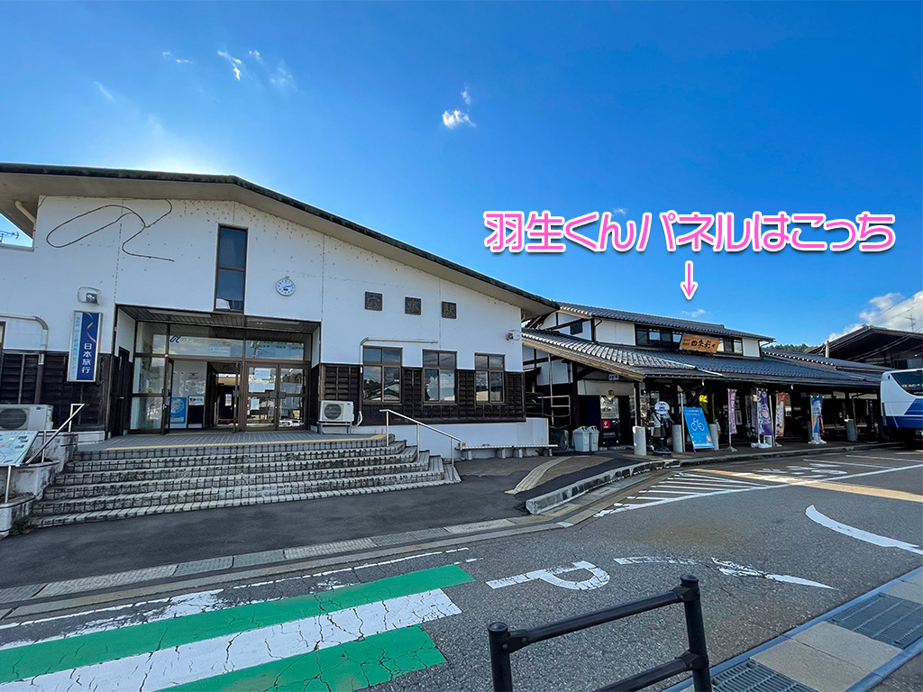 最初、穴水駅の駅舎の中を探し回りましたが、羽生くんパネルは「道の駅あなみず」の方でした