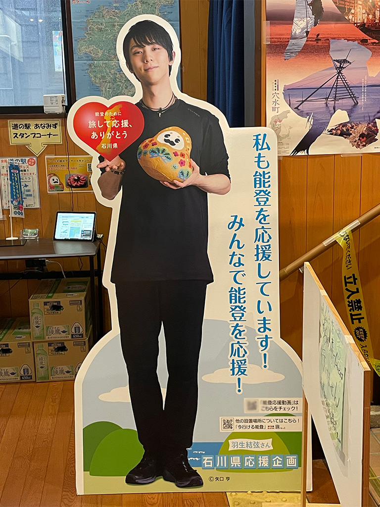 穴水駅併設の「道の駅あなみず」には、プロフィギュアスケーター羽生結弦選手の石川県応援企画パネルも設置されています