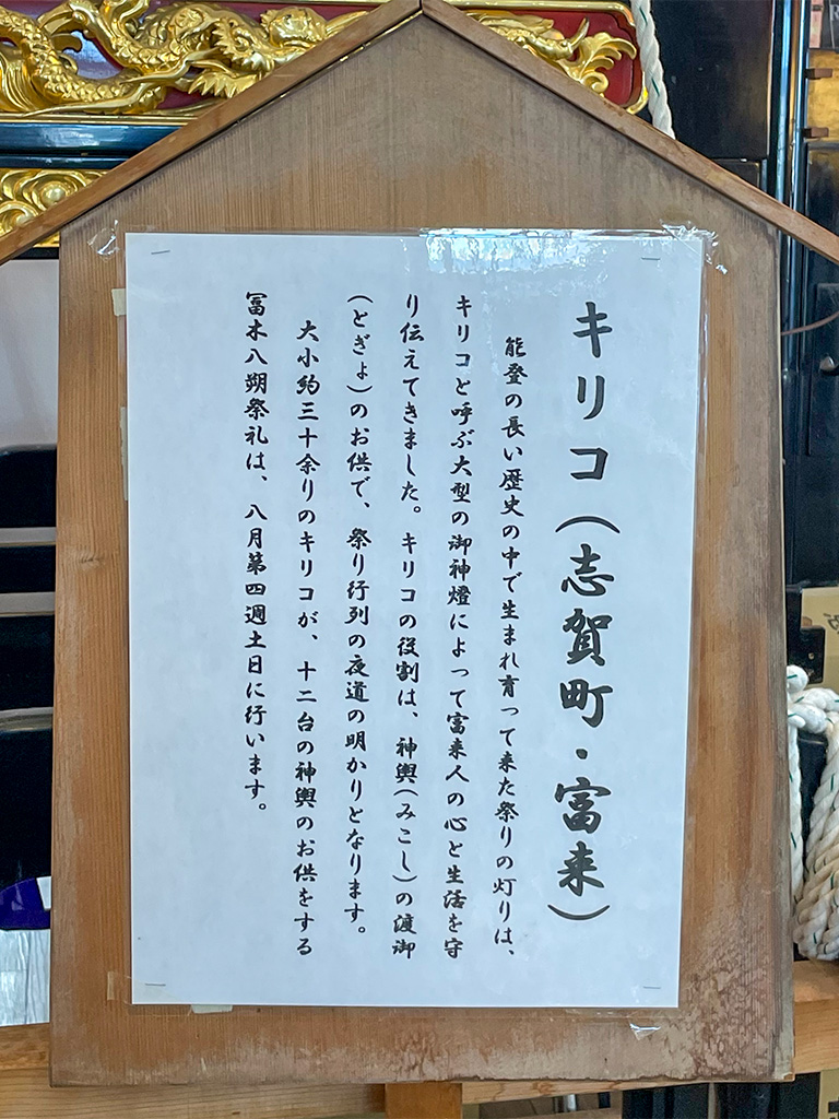 「キリコ」は、能登のお祭りに欠かせない巨大な灯籠で、まぁ神輿と一緒に担ぎ出される巨大な山車のようなもの、かな
