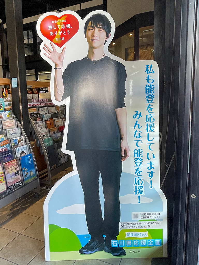 石川県輪島市にある「道の駅輪島 ふらっと訪夢」には、2026年3月31日までプロフィギュアスケーター羽生結弦選手の石川県応援企画パネルが設置されています