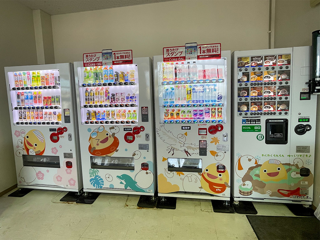 待合室の自動販売機にも様々なポージングの可愛らしいわくたまくんがいます♪